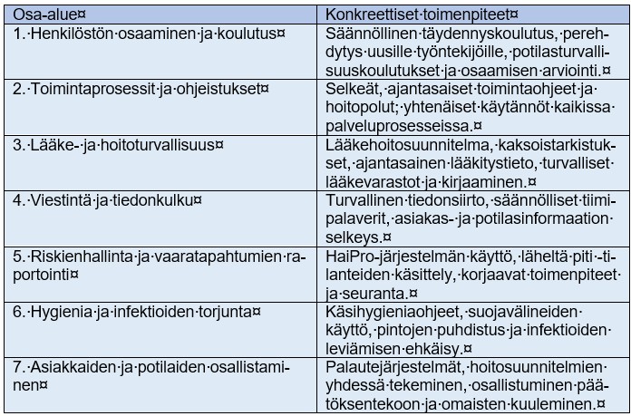 Taulukko 1: Asiakas- ja potilasturvallisuuden varmistaminen